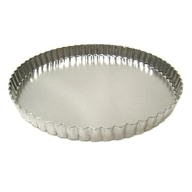 This tinplate steel tart pan with removable bottom is 9.5 inches in diameter.